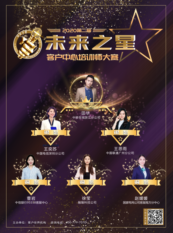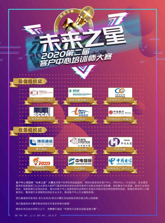 2020第二届客户中心培训师“未来之星”大赛的成功举办得到了全国各地区客户中心(呼叫中心)行业协会、各全国性服务机构客服部门以及全国性大型BPO服务机构的大力支持。在此我们对各协办单位、所有评委老师表示诚挚的感谢,同时感谢全国各地区/各相关行业/所有参赛选手的热情参与。期待在各位的共同努力之下,将赛事打造成“年度性行业职业技能金牌大赛”。