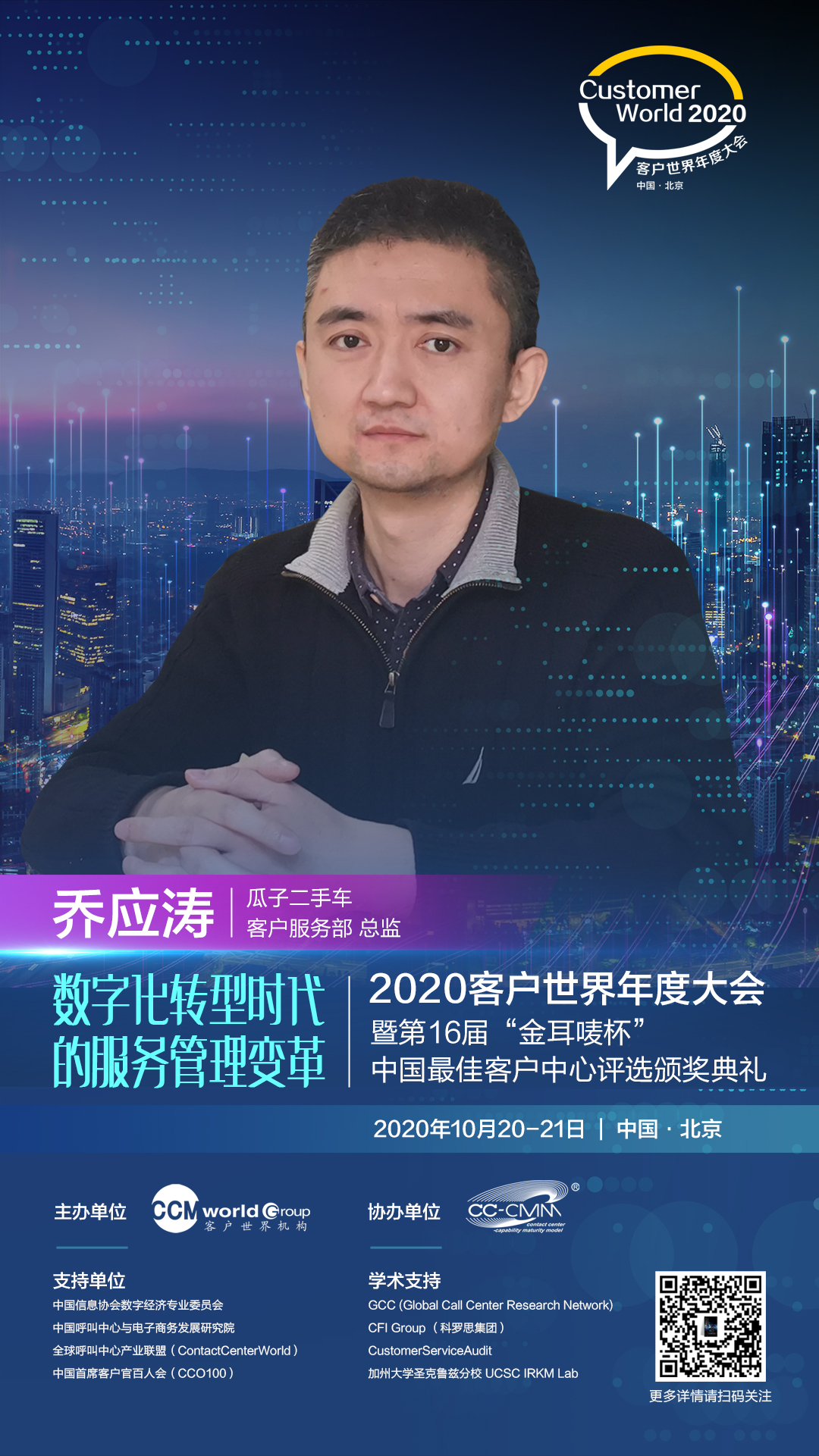 客服行业知名的“乔帮主”,从事客户服务行业18年,现任瓜子二手车客户服务部门总监,历任万达集团、好车无忧、赶集网、高德地图等企业的客服管理工作。热衷于推进行业升级和发展,发表过多篇具有前瞻性的文章。