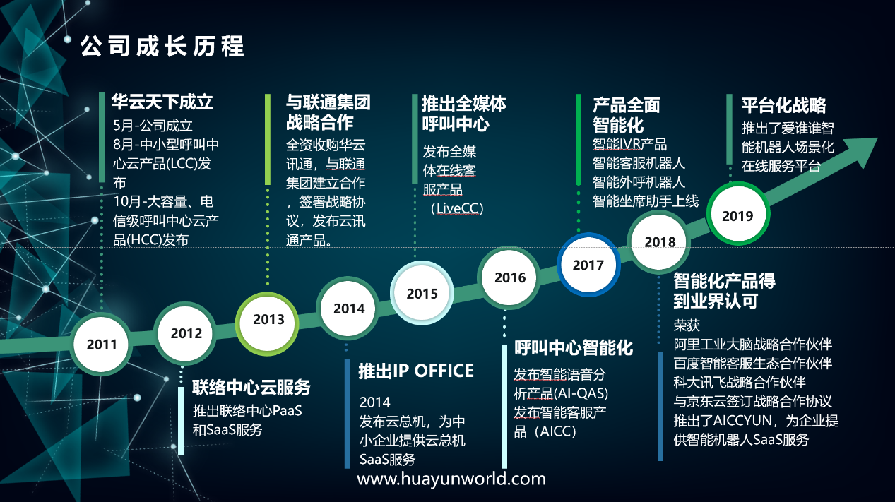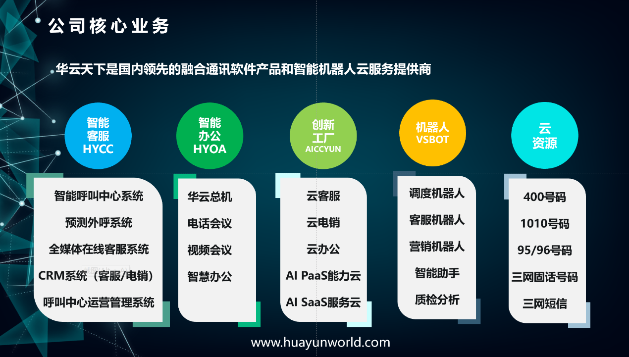 华云天下是中国领先的企业智能联络中心和智能机器人云服务提供商,基于多年来呼叫中心、融合通信、智慧办公、智能客服、智能质检、座席辅助、智能机器人、人机对话训练等技术的研究和产品研发,结合人工智能、大数据、云计算等新技术,提出了“新服务、新运营”的创新理念,研发出来智能客服系统、人机对话系统、业务智能决策系统、机器深度学习以及行业知识图谱等多项子系统,对原有产品体系和服务体系全面升级。为企业提供智能联络云(HYCC)、智能办公云(HYOA)、虚拟调度员(VSBOT)、智能机器人场景创新工厂(AICCYUN)等一站式、场景化的数智运营服务。