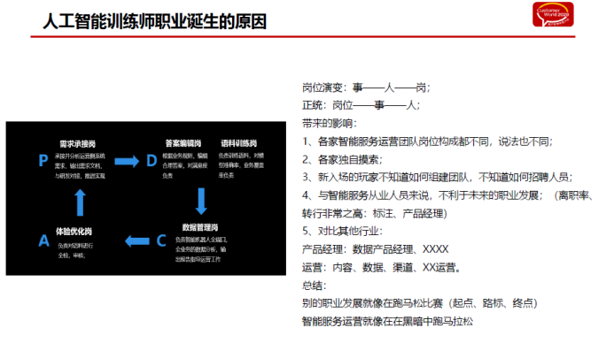 但引进智能服务的同时,却发现绝大部分智能应用难以收获客户满意,究其原因于智能产品做得还不够好,技术不够牛,缺少从业务运营能力角度做思考,这样的认知带来的决策和行为自然就变成了不断地去升级智能产品装备,不断采购,不断换系统。之所以出现类似这样的情况,根本原因还是在于忽略了智能服务产品背后的使用者的提升,目前对于人工智能训练师的工作职责与能力界定都存在模糊化的困境,甚至不知道应该如何评定人工智能训练师团队工作绩效的优缺。这样带来的结果将会是人工智能服务产品没法发挥出原本的功效引发企业引进智能服务产品的迷茫、相关的从业人员也难以得到长足的发展,导致从业人员的锐减和消逝。