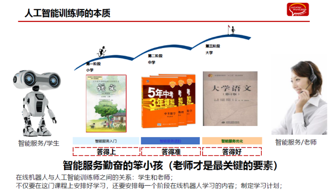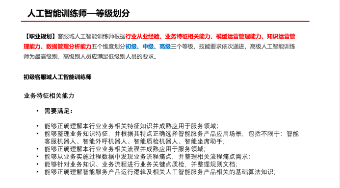 近几年,智能服务产品作为人工智能技术在服务行业的最佳落地应用实践,其为客户服务中心、企业提供了新时代下客户对于服务高标准、严要求的服务体验与企业运营成本之间平衡的最优解决方案,同时也为各大厂商的转型发展提供长足的动力。智能服务行业发展迅猛的同时,问题与矛盾也越发突出:即智能服务产品飞速升级换代的同时,产品背后使用的人员成长和运营技能提高还是在原地停留,这也最终导致智能服务的应用就像是:一个人获得了一把绝世武器,但没有与之匹配的内力基础,空有武器面对内力深厚的高手挑战往往被一脚撂倒。“欲练武功,先修内功”,无论是从企业的业务、客服的诉求,还是产品的进步、从业者的迷茫来说,客服部门都需要回归本职轨道,重点关注智能时代客服人员(即人工智能训练师)的成长及能力发展,才能让人工智能技术发挥出应有的价值。2020年2月21日,国家职业资格培训鉴定实验基地人工智能高新技术能力评价考试项目已实施,旨在培养人工智能技术服务和开发应用型人才。