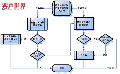 如图,这是一个简化了的订单处理组的业务流程图,其中涉及两个基本的业务流程即订单受理与订单查询。订单处理组的座席代表通过对客户需求的判断并结合企业实际库存情况,最后生成订单。大家会发现,在这个流程图中并没有涉及到来自网络的订单,这并不意味着订单处理组不需要进行网络订单的审核,事实上,为了提高下一业务组的工作效率,订单处理组中会有专人负责审核网络订单的有效性,对有效的订单进行最终的生成;对无效的或不明确的订单则会根据网络用户的联系方式与其确认。不过,在此我们姑且不做更深入的讨论。