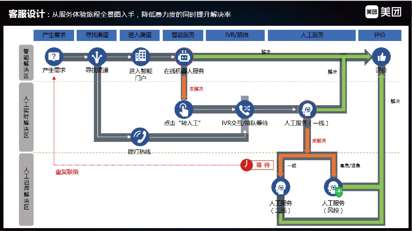 如上是美团服务业务中心结合实际数据从客户的问题发生与问题解决双重维度分析,找到合适的解决方案的实际案例,通过落地应用来实现服务设计的价值。