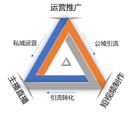 其中,短视频内容输出,负责种草引流,直播转化变现,促进私域互动,而运营推广则是驾驶舱,根据需求定位及方向,策略布局,进行信息流投放(公域)+粉丝(私域)细节运营,联动短视频与直播,引爆公域流量池。这样的铁三角组合才能最大化的发挥出直播短视频运营的价值(图1)。