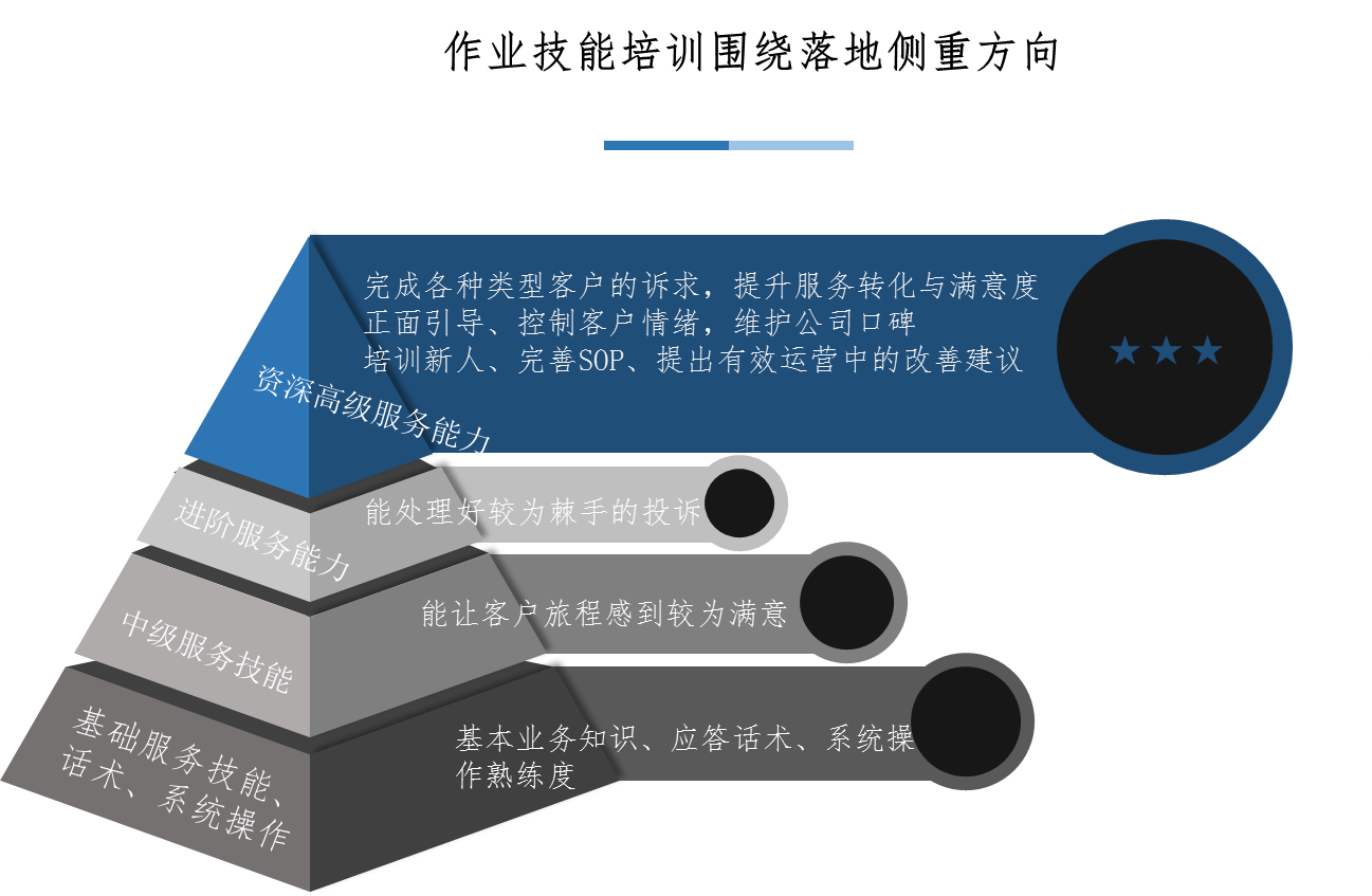 首先,作业技能要求是地基,是中心正常运转的发动机,设计开展高效的培训课程就是必须条件。那么在培训系统中,此环节与员工接触点是最多的,覆盖面是最广的,影响员工满意度也是最高的。笔者认为应该从如图1所展示的侧重开展培训,并一一检验、检视效果是否达到。