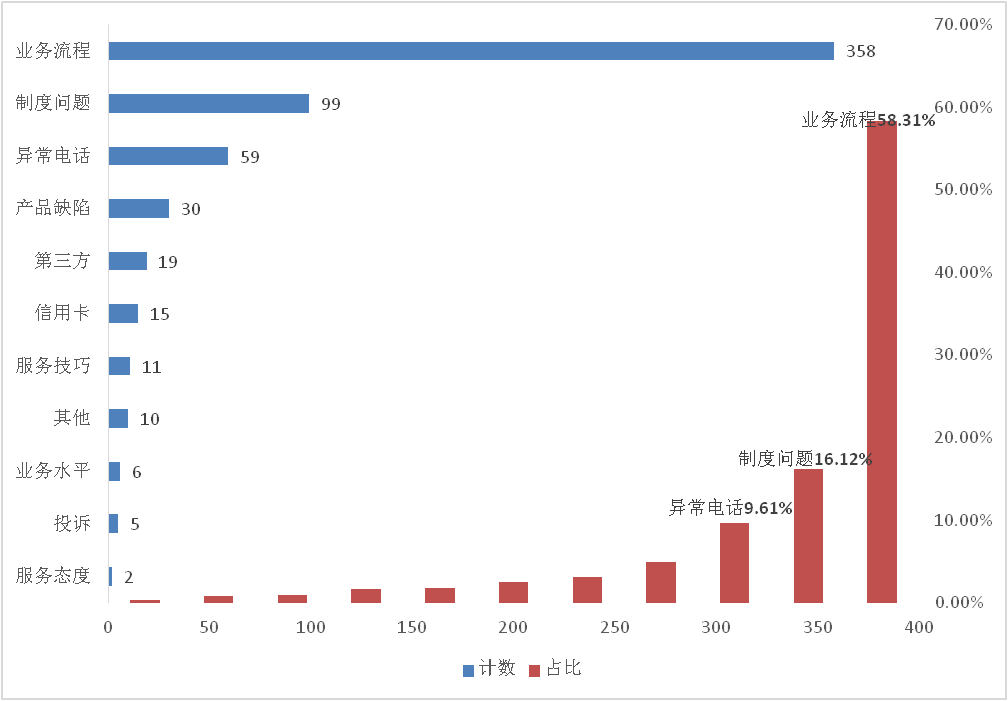 举例如下,我调取了某年连续三个月的不满意录音,根据不满意发生的原因进行数据分类,其中业务流程占比58.31%、制度问题占比16.12%、异常电话占比9.61%,那么解决上述问题后客户满意度将会稳步提升(图1)。