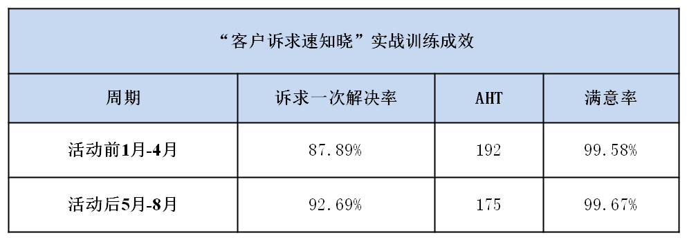 措施1:“客户诉求速知晓”实战训练:低星级人员责任不满意数量占46%,主要原因为低星级人员业务能力和沟通能力均有欠缺,为提升员工“会听能说”的实战能力,通过抽检685通智能语音真实案例进行梳理发现,客户在通话前三句明确表达诉求的占比高达86.42%,且前三句表达的诉求与最终诉求的关联度也高达87.26%,因此抓取客户前三句表达成为了快速精准掌握客户核心诉求的关键。由此创立了“客户诉求速知晓”演练型实操训练。定位训练80名低星级不满意较多的人员,提升其沟通能力和业务能力,以降低其不满意数量。实战训练效果显著,具体成效如表1。