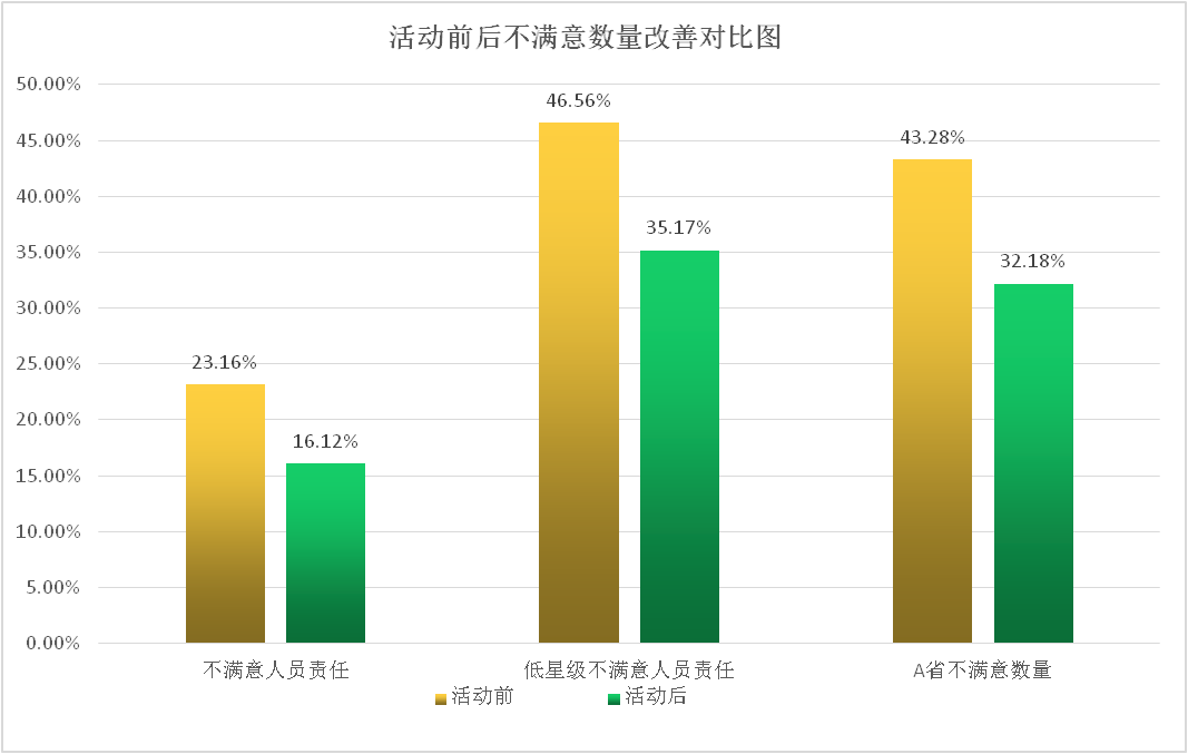 措施2:与服务省公司开展“精准服务,精彩互动”活动,促进双方在服务过程中相互融合、共同服务好客户。开展“互学互动、互培互训”计划,邀请专家队伍走进双方一线,开展岗位体验、专题讨论,提升一线服务能力。针对新业务开展专题讨论,并制定业务服务微场景知识框架搭建和典型案例分析,针对新业务制定服务策略,以降低新业务推广造成的不满意数量。