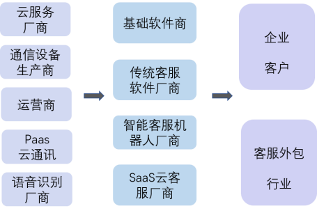 在市场上,竞争格局日渐明朗,总体上是百家争鸣,百花齐放。据统计,2019年我国的服务类机器人市场规模达21.7亿美元,且市场划分初步形成。由云服务厂商、通信设备生产商、移动运营商、Paas云通讯、语音识别厂商等,组成上游产业链;基础软件商、传统客服软件厂商、智能客服机器人厂商和SaaS云客服厂商,处在中游,向下就是企业型客户和客服外包型客户(图1)。
