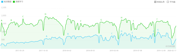 人工智能领域的另一概念更显生机,那就是——知识图谱。从图2“知识图谱与深度学习”的百度指数对比可看出:深度学习的受关注度从18年开始,逐渐开始小幅下降,而知识图谱的受关注度,一直在稳步缩小与深度学习间的差距,可想见的是,往后的几年里,将会迎来一场大爆发(图2)。