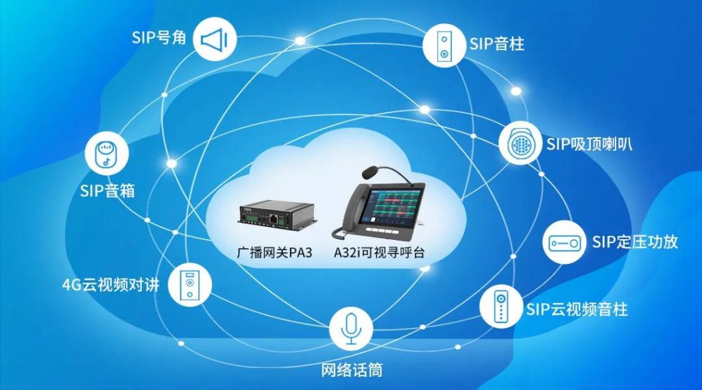 方位广播解决方案的核心产品包括PA3广播网关和A32i可视寻呼台。在局域网应用,该两个核心产品可以自组网,实现广播和对讲功能。如果要实现云广播功能,还需要引入第三方的融合广播系统。通过PA3广播网关技术,可以衍生出系列的广播产品,包括SIP音箱、SIP音柱、SIP定压功放、4G云播可视音柱等。