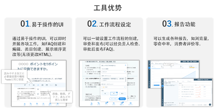 在本项服务中,不仅涵盖现有的知识管理服务提供的常见问题解答(FAQ)内容创建、分析和报告,还提供常见问题解答(FAQ)页面(用HTML代码编写信息后设置标签,以便搜索引擎易于理解)的构建以及搜索引擎优化(SEO)解决方案。通过一系列措施,消费者在使用谷歌等搜索引擎进行信息检索时,会优先展现合适的内容,获得理想的搜索体验。同时,因为配备了常见问题解答(FAQ)引擎,不仅可以进行关键词匹配,也支持自然语言搜索,所以可以适时地展示消费者搜索的相关内容,以及可以使用作为基本功能的建议功能,即在输入过程中展现回答候选项。本项服务有两种导入定价:初期费用30万日元、月结费用10万日元起。
