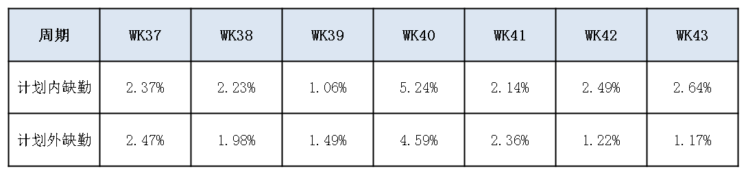 不过这种预测方法比较粗略,想要精细化的预测,我们还要考虑节假日、季节、气温和突发事件等因素,例如我们想要测算10月份的人员配备情况,那么在考虑缺勤耗损的时候就要考虑上国庆假期对于缺勤的影响,很多员工在国庆期间都想外出游玩休班,但是客户中心行业的节假日休班并不固定,这样就会导致员工请假,缺勤率自然会升高,所以在考虑缺勤耗损的时候就不能仅考虑历史达成情况预测了,如下图所示,某业务WK37-43这段周期的计划内外缺勤,其中WK40计划内外缺勤都很高,而WK40所处于的日期是10月第一周,也就会国庆假期期间,这段期间员工的缺勤会比其他时间要高,所以在考虑未来缺勤预测的时候我们需要抛出WK40的影响,否则预测出来的缺勤数据会虚高。