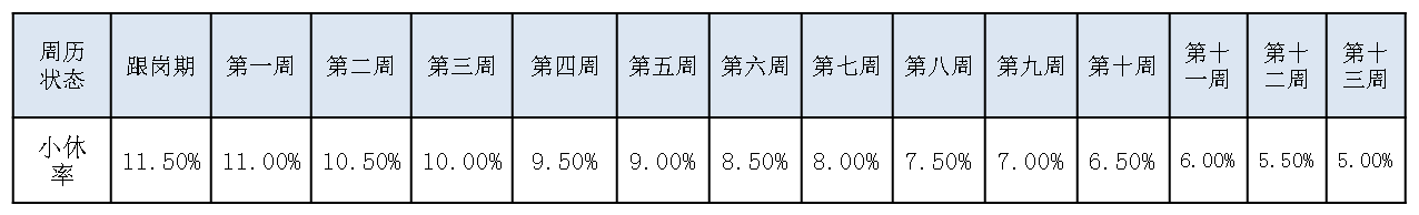当然,小休和缺勤一样,想要精准预测的话也需要考虑节假日、季节和气温影响,并且除此之外还需要考虑新老员工的影响,可以采用平均处理时长的预测方法,新员工按照小休率的成长曲线进行预测,如下表是某业务测算员工的小休率成长曲线,可以根据新员工的周期进行小休匹配预测。