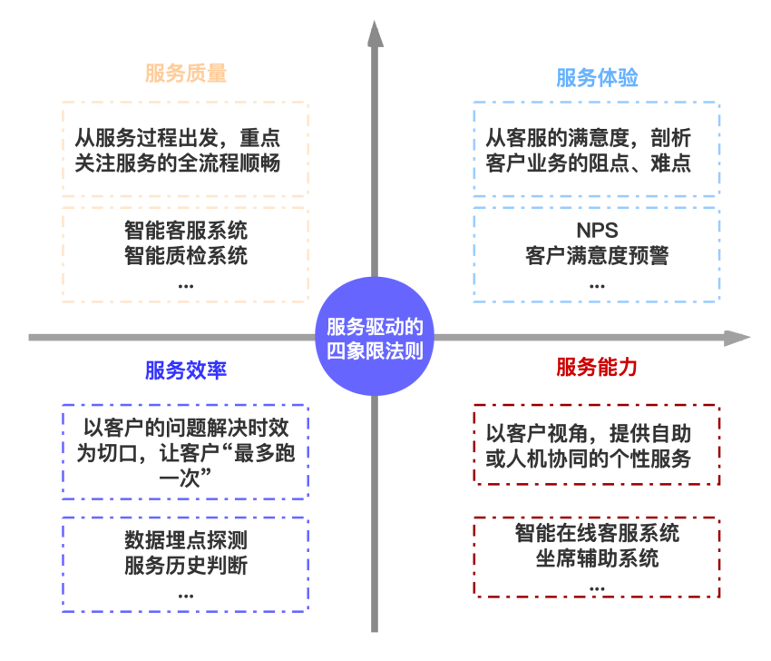 那么问题来了,我们是要在四个方面共同发力改造吗?对于中小银行,很难集聚足够资源同时进行项目优化。因此,我们可以根据服务驱动的四象限法则,来确定更重要的内容,集中发展比较优势。