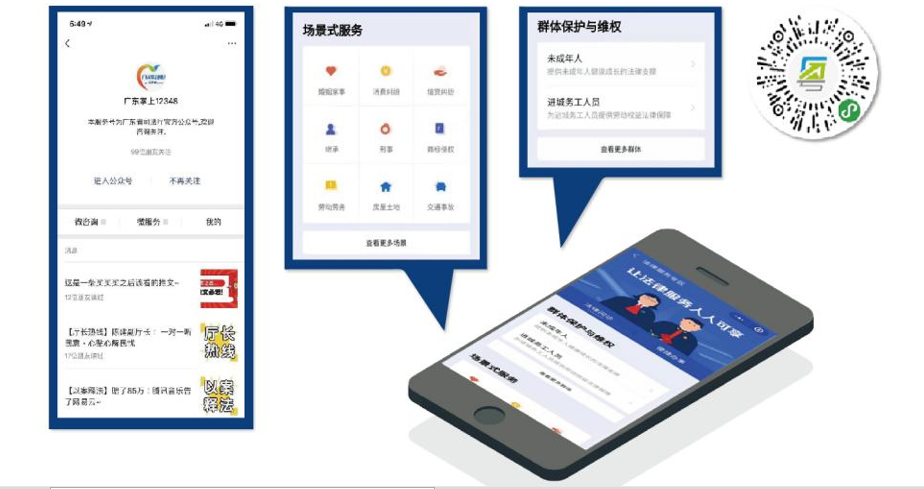 2019年至今,广东法律服务网继续完善网站、APP、微信公众号等各类服务平台,上线了智能化、场景化的“粤省事”法律服务专区,累计推出未成年人、婚姻家事、劳动劳务等15个应用场景,涵盖1142个常见问题、1102条律师常用意见、51个推荐服务事项。在项目运营期间,平台相继获得了金音奖、微服务卓越奖、民生示范工程、全国公共法律服务工作先进集体等众多的荣誉奖项,2019年全国公共法律服务会议、世界律师大会等先后将广东法律服务网运营中心作为其中一个参观点,对平台给予了充分肯定。
