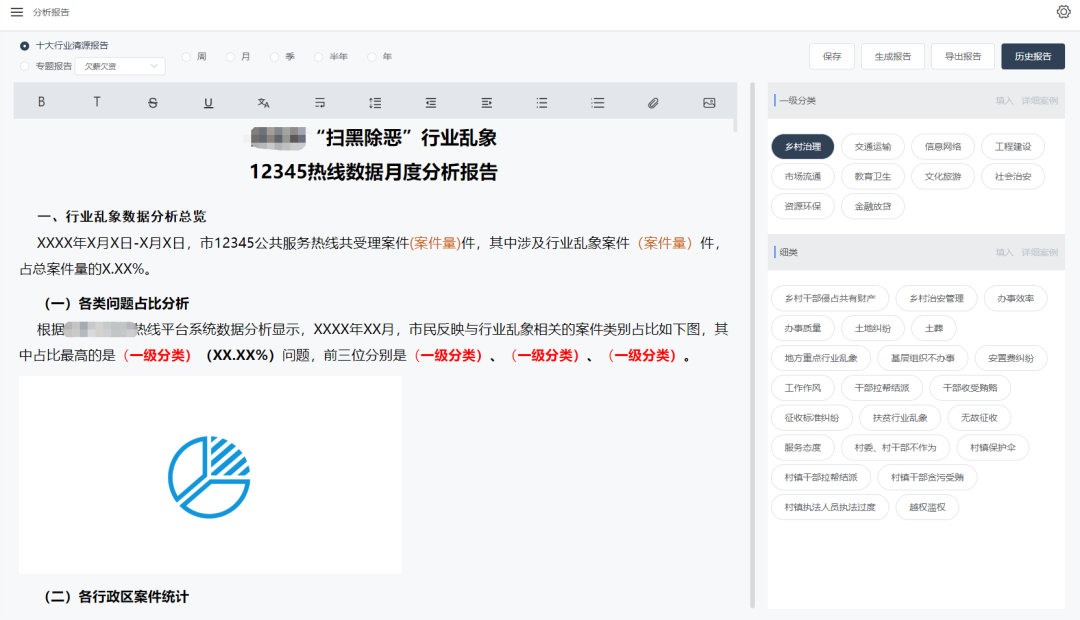 专题报告:专题报告是职能部门向上汇报工作情况的文件材料,可分为周报、月报、季度报、半年报、年报,内容主要是周期内的数据总览、各类问题的占比情况、案件变化趋势、TOP K的数据统计、各行政区案件统计、高频热点问题统计、突出案件统计、重点领域数据统计等。如图3所示,报告的模板可在平台里定制,系统会基于模板配套数据后按生成策略,在对数据进行分析后,自动生成报告,并将报告提供给目标用户进行深度分析,除了辅助领导研判以外,还可以推送给行业、区域的主管领导,以达到行业整治、服务提升的效果。相比以往的手工数据分析和报告生成,自动化的数据分析和报告生成工具有效地提升了工作效率和数据分析研判的及时性,大大降低了热线数据分析的成本,并让数据分析结果产生了更多的价值。