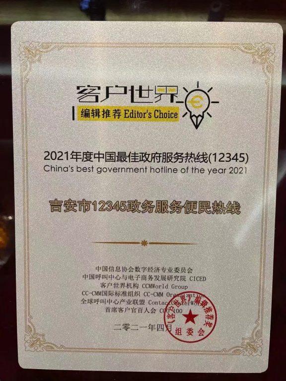 吉安市12345政务服务便民热线荣获《客户世界》编辑推荐:2021年度中国最佳政府服务热线(12345)