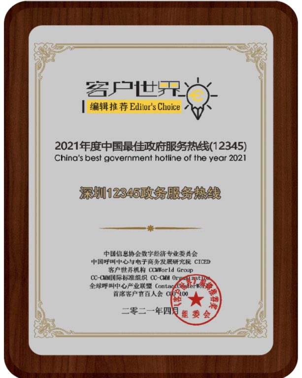 深圳市12345政务服务热线荣获《客户世界》编辑推荐:2021年度中国最佳政府服务热线(12345)