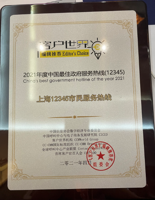 上海市“12345”市民服务热线荣获《客户世界》编辑推荐:2021年度中国最佳政府服务热线(12345)