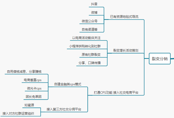 在冷启动社群运行进入正轨后,社群即将迈入下一阶段裂变分销。通过抖音、公众号、微博、自有app、小程序、MGM活动等全面地毯式引流至对应社群;利用分期商城电商能力,打通cps功能,接入社交分销中间平台(如蜜源),渗透进外部市场环境已经构建成熟的社群组织和培训组织,借力为公司品牌教育传播,预期能带来不菲的新流量(图4)。