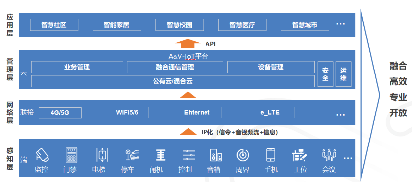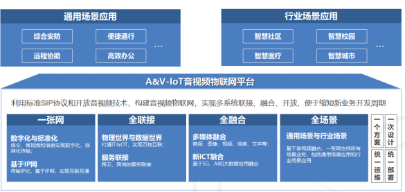 A&V-IoT音视频物联网,即融合音视频技术(Audio & Video)和物联网技术(IoT),音视频终端通过物联网相互连接,通过SIP通信协议和开放音视频技术实现实时音视频流媒体互联互通。