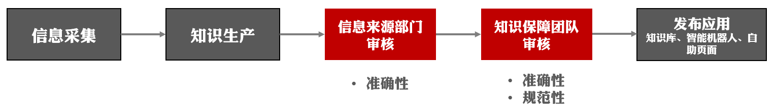知识生产是知识保障团队接收到各类信息后,基于对各服务场景和客户体验的理解,将信息加工处理成可供各前台服务渠道调用的知识,包括根据信息属性进行分类,依据信息属性和模板对信息进行结构化和客户化转化,在内容和形式上满足各前台服务渠道调用需求。知识生产职责主要由知识保障团队承担,可以用知识生产及时性、准确性、规范性等指标来评价知识采集/生产岗位的工作质量。知识生产及时性主要评价从信息收集环节到完成编辑的过程是否满足时限性要求,如知识采集/生产岗位需要接收到信息的4小时内完成知识编辑并提交审核;知识准确性和规范性用来评价知识生产的质量,可通过信息来源的准确性审核、各前台服务渠道满意度评价和质检抽检等方式检核评价。