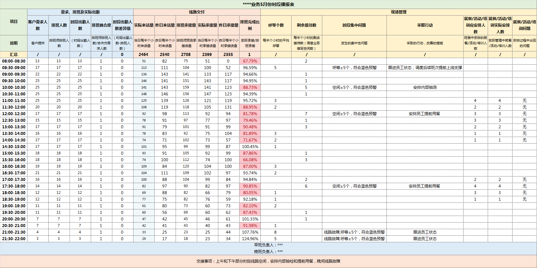 “现场实时管理应急方案”不是固定不变的,可以根据各业务现场管理的实际情况进行制定。言归正传,下面就由笔者带领各位了解时段播报表的组成。