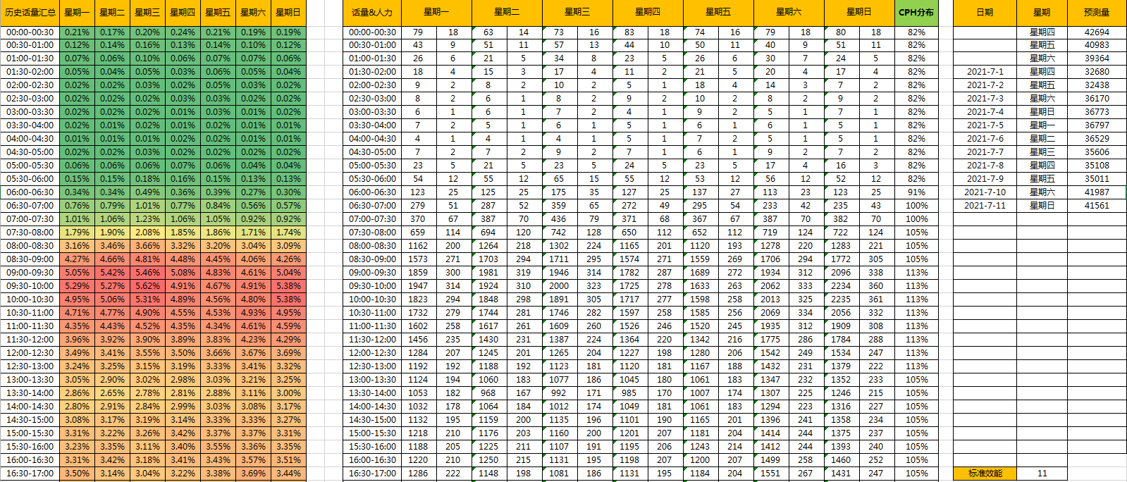 时段话务量预测:使用最近4-5周新发生的实际话量数据,将周期内每个时段的话量÷全天来话量总和=时段话务量占比,用此占比数据作为未来一周时段话务量占比的预测数据。