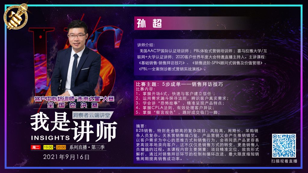 【我是讲师(第3季)】的主题是:未来已来;同时也是2021第三届中国客户中心培训师“未来之星”大赛-全国总决赛的比赛环节。选手通过自选主题/一小时直播和互动答疑的方式,展示培训师全面的能力和个人风采。9月16日19:00-20:00,总决赛第二位选手是:来自美团的孙超。