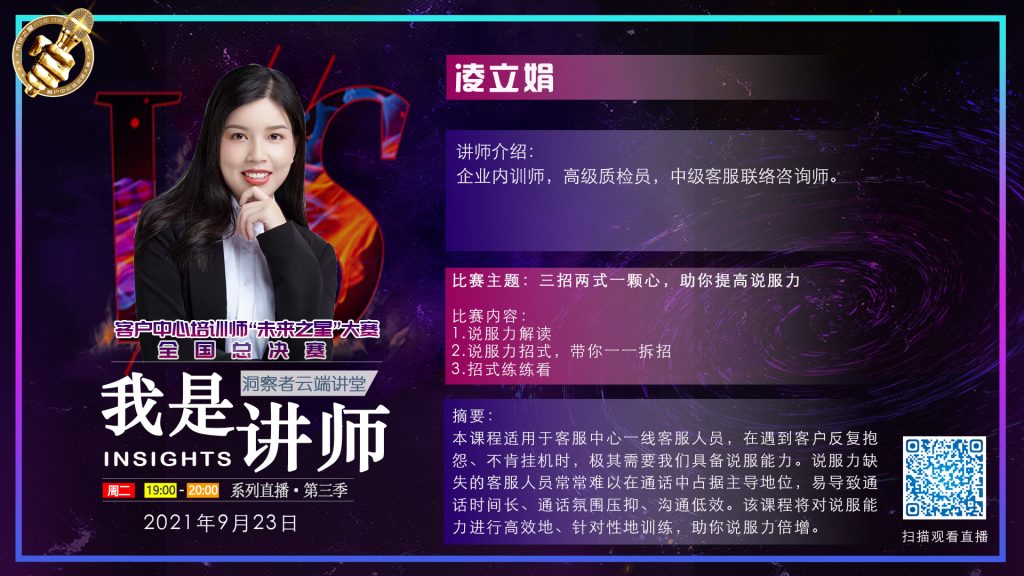 【我是讲师(第3季)】的主题是:未来已来;同时也是2021第三届中国客户中心培训师“未来之星”大赛-全国总决赛的比赛环节。选手通过自选主题/一小时直播和互动答疑的方式,展示培训师全面的能力和个人风采。9月23日19:00-20:00,总决赛第四位选手是:来自中国南方电网广西电网的凌丽娟。