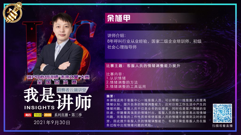 【我是讲师(第3季)】的主题是:未来已来;同时也是2021第三届中国客户中心培训师“未来之星”大赛-全国总决赛的比赛环节。选手通过自选主题/一小时直播和互动答疑的方式,展示培训师全面的能力和个人风采。9月30日19:00-20:00,总决赛第六位选手是:来自国家电网客服中心南方分中心的余馗甲。