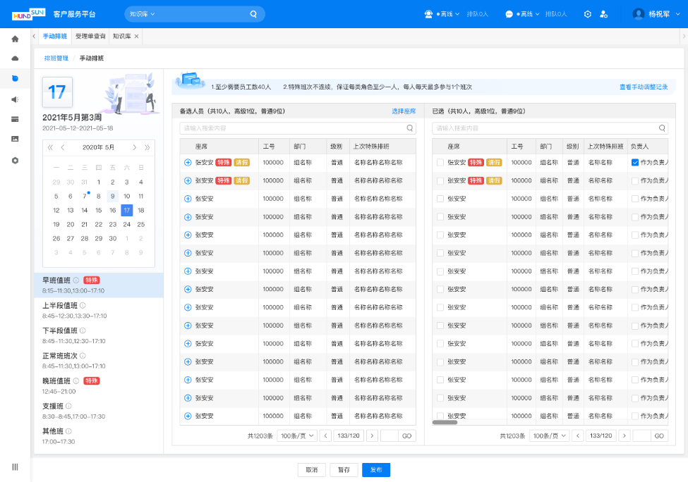 根据以上的数据分析和解决思路结合客户实际的应用需求,我们在新一代的客服中心中推出智能排班功能,支持实际排班中如下场景: