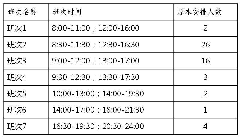 最后可以得到在不同时段下需要的座席人数,在根据具体的班次要求进行组合,进而得到一个优化后的班次人数安排,如表6。