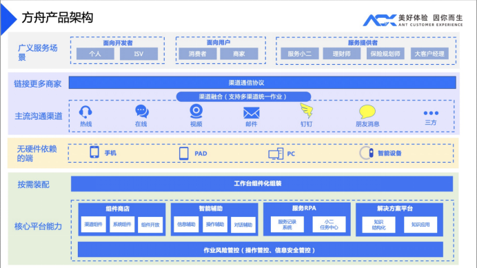 方舟通过产品框架的组件化、配置化,像搭积木一样,快速搭建不同服务场景的作业工作台,集成在热线、钉钉、支付宝朋友、微信等多渠道,支持小二在手机、PAD、PC多端操作,保障非可信环境的安全随时随地组织服务。