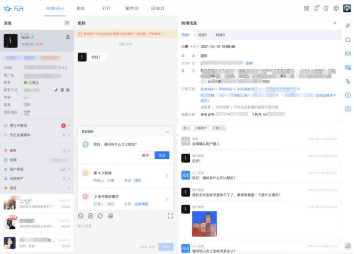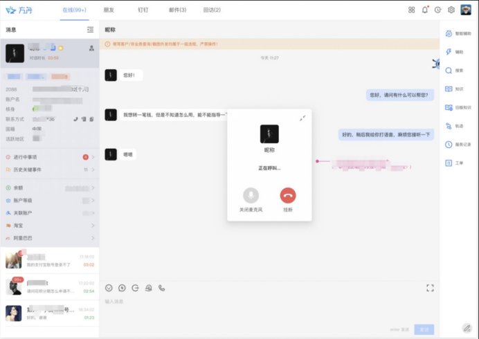 兼容多渠道,用户从不同用户端来访,如:支付宝我的客服、95188、支付宝朋友、钉钉、小程序等,客服小二都可以用同一套一体化的工作台提供服务。对于新渠道,还建立了通用的接入标准,能够快速进行对接。渠道之间也并非孤立的,通过渠道融合通讯能力,在线咨询可以转热线客服甚至直接与在线客服语聊,热线咨询也可以通过用户端发送图文,这种创新应用可以大大提升用户的体验。