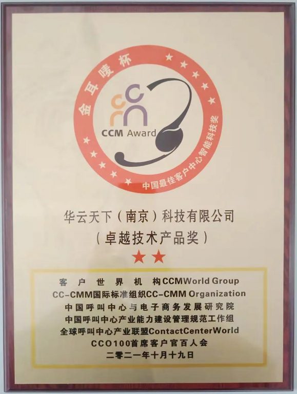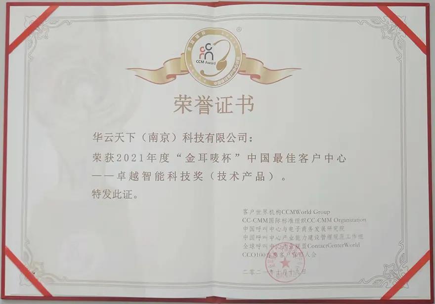 华云天下荣获2021“金耳唛杯”中国最佳客户中心卓越智能科技奖