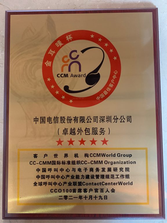 中国电信股份有限公司深圳分公司在本年度的“金耳唛杯”中国最佳客户中心评选中获得:卓越外包服务奖。