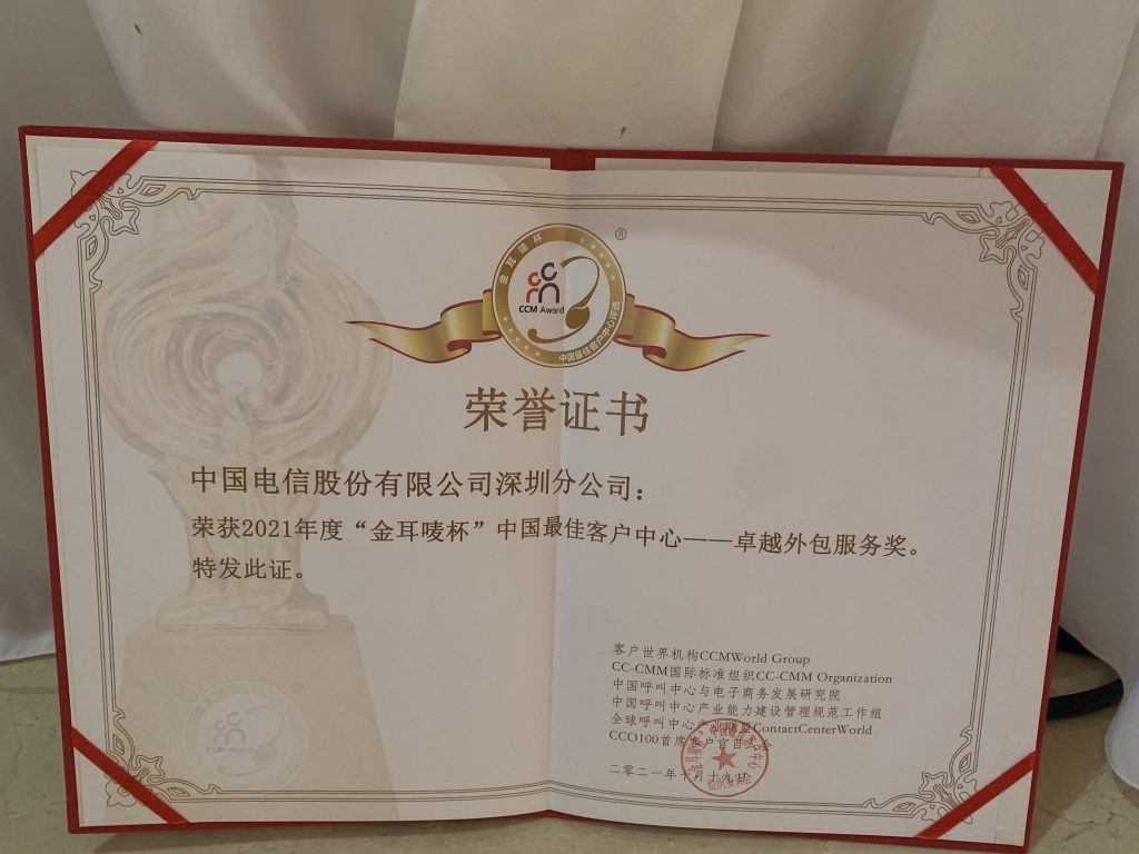 转载请注明来源:中国电信股份有限公司深圳分公司荣获2021“金耳唛杯”中国最佳客户中心卓越外包服务奖