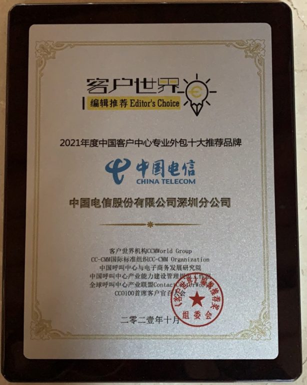 10月19日,北京,2021客户世界年度大会成功举行。中国电信股份有限公司深圳分公司荣获“2021年度中国客户中心专业外包十大推荐品牌”奖项。