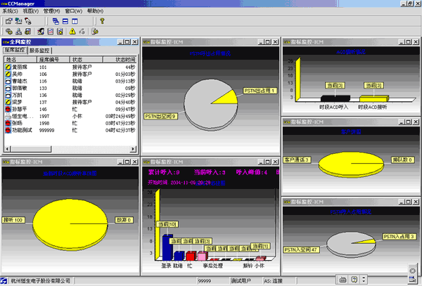 CCManager是一个实时的呼叫中心监控工具,它提供对设备、座席、技能组、业务组及其它各类对象的监控功能。提供自定义指标监控系统,如针对座席状态,客户排队情况等定制指标,通过指标窗口查看。
