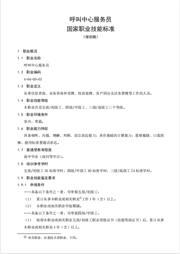 根据《中华人民共和国劳动法》有关规定,人力资源社会保障部、工业和信息化部共同制定了呼叫中心服务员等6个国家职业技能标准,于2021年10月21日发布【人社厅发〔2021〕81号】文颁布施行。原相应国家职业技能标准同时废止。