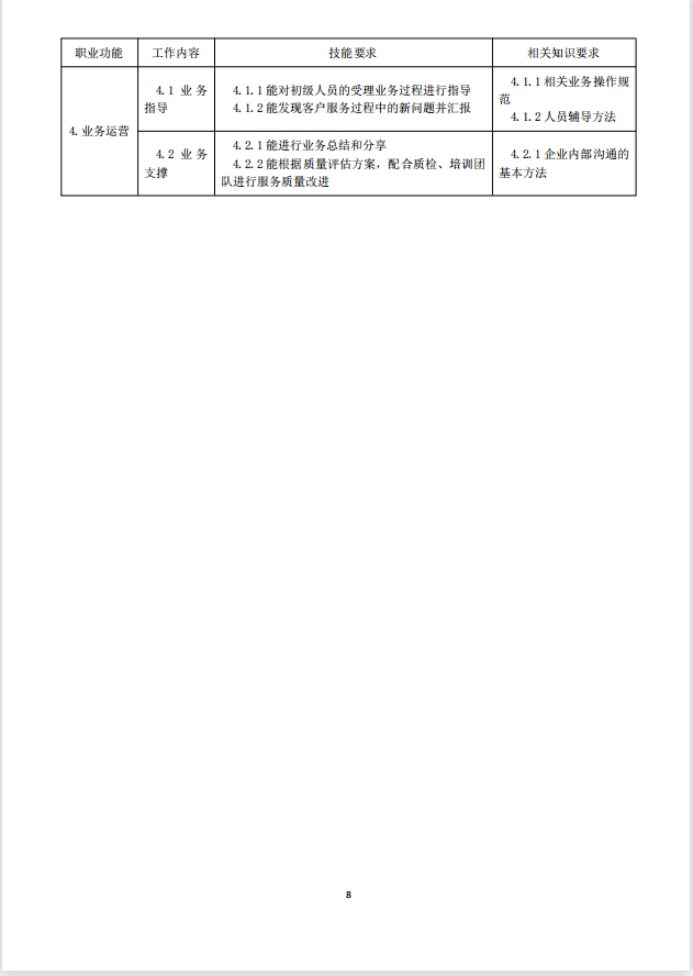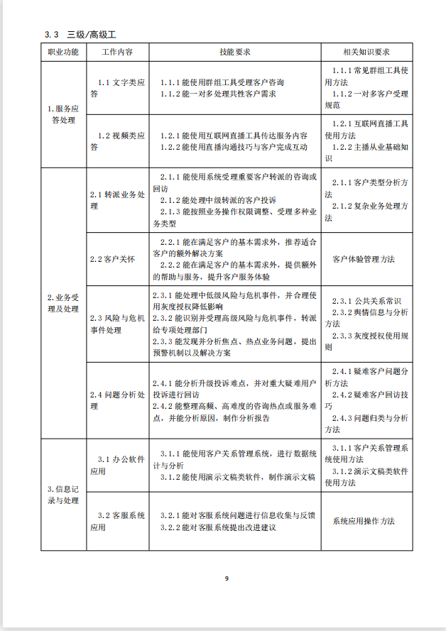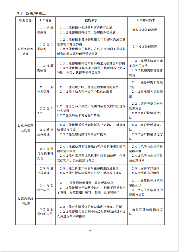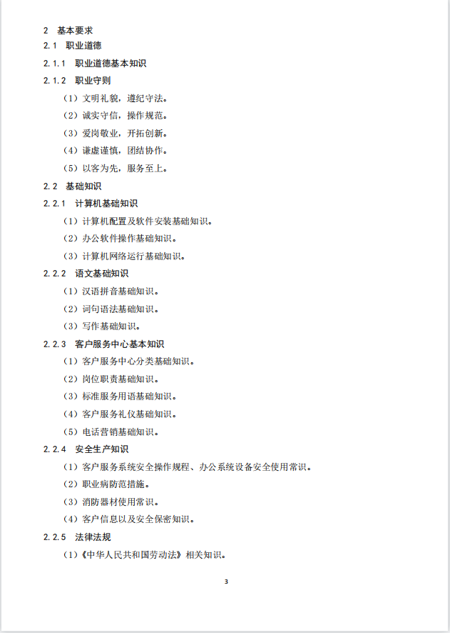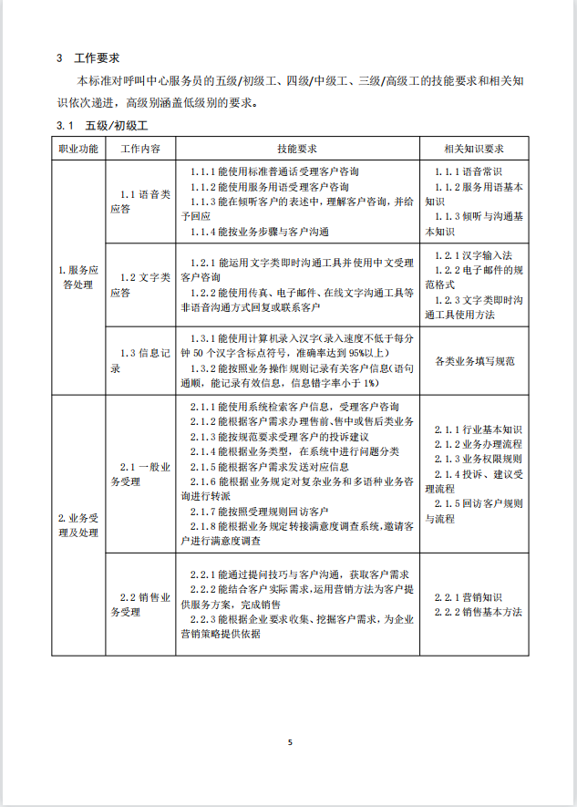 本标准对呼叫中心服务员的五级/初级工、四级/中级工、三级/高级工的技能要求和相关知识依次递进,高级别涵盖低级别的要求。
