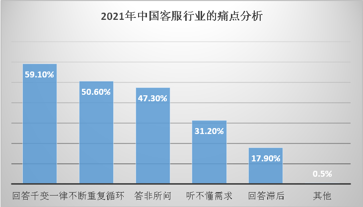 那么体验经济下,当下所谓的智能客服需要哪些改变呢?根据2021的调研报iiMedia Research(艾媒咨询)数据显示(图1), 回答千篇一律是用户智能客服使用过程中遇到的最大痛点(59.1%)。其次,重复循环操作(50.6%)、答非所问(47.3%)、听不懂需求(31.2%)、回答滞后(17.9%)也成为困扰用户的几大问题。艾媒咨询分析师认为,智能客服可以通过扩充自动回复内容存储库,针对客户常见需求设计更为多样化的回答范本,提供更有针对性的反馈,以改善用户体验。