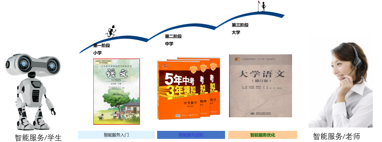 如图1展示,把智能服务当成是一个学生,业务优秀的人工智能的训练师就是机器人的老师。学生要把老师所有的知识都学完,但并不是囫囵吞枣一口气吃成一个大胖子,而是要给机器人做成长路径规划。训练师需要规划出每个阶段机器人应该学习什么知识,小学学习语文、数学;初中、高中学习物理化学,大学学习高等数学。一定要摒弃什么都想做的思想,唯有基础扎实,方才能让在线机器人未来真正成为客服中心独当一面的服务者。业务场景之间的边界也并非一直不变,可以畅想,在技术非常成熟的未来,也许在线机器人真的能够达到电话客服的服务水平,服务更大的业务范围,甚至比人工客服做得更好。