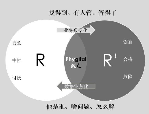 无论是新旧哪个世界,万事万物都有其逻辑。洞察本质,看到那些表面上看不见的东西和内在联系,分析其底层逻辑,才能找到真正的区别和能力内核。而数学和软件就是把现实世界的东西进行抽象,找出其中的规律,然后再利用规律进行创新或者复制。所以这种现实与虚拟间的映射关系可以借抽象代数表达,以R代表现实世界的元素集合、R’代表虚拟世界的元素集合。数实相生的客户新世界≧现实世界(R)+虚拟世界(R’)。