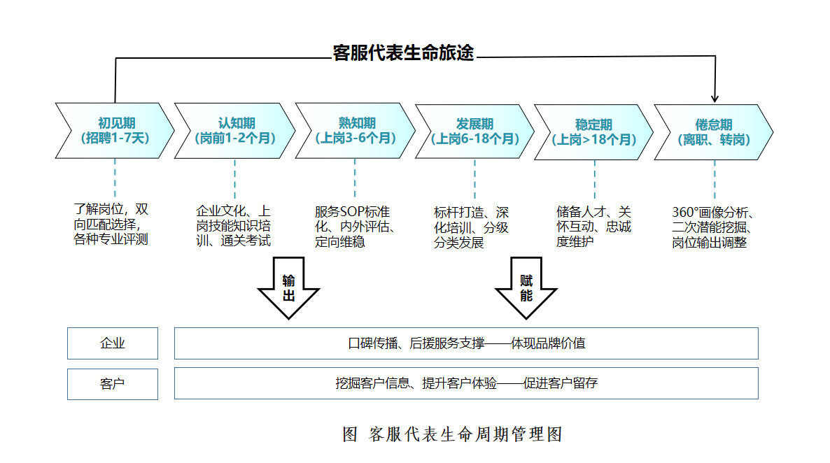 “客户”生命周期管理。客户是有“生命”的,一个客户从接触到离开都是一段生命旅途,围绕我们服务对象的完整服务过程,在传统营销领域被称为“客户生命周期”。当然具体到不同的行业,不同的服务对象,对此均有不同的详细定义。如客服代表是内部客户,他们也是有“生命”和“旅途”的,他们的“客户生命周期”理论是指从公司与其个人建立业务关系到完全终止关系的全过程:
