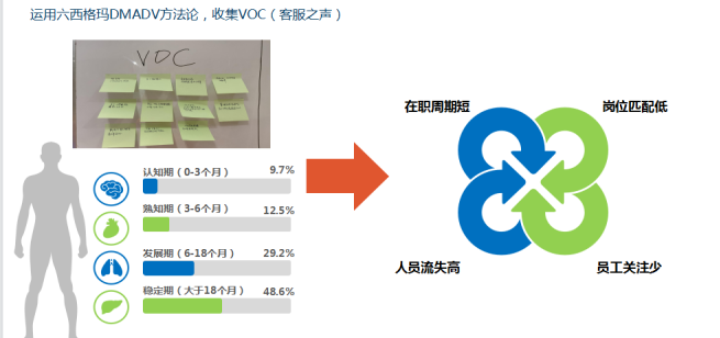 “客户”满意度管理。客户联络中心客服代表这个岗位就是企业的门面,前面我们详细剖析了工作特性,他们每天面对形形色色的人们和复杂的业务,如我们产险热线中报案、投诉等紧急的、负能量的事件居多,公司灌输理念也是“客户就是上帝”。但实际相对公司内部其他部门,他们同时还扮演着内部客户的角色,换位思考,如果企业不及时、足够重视他们的痛点,未及时了解内部客户/客服代表的心态变化,诉求得不到及时解决,心存不满或情绪,必然没有适宜的服务水平促使他们以最大的效率进行工作,那么外部客户所接受的服务多少会受到不良影响,严重的还会引起外部客户的不满甚至丧失外部客户的忠诚。目前行业的常规做法就是实行员工满意度调查,但大部分企业对这类问题了解不够深入,往往流于形式,经常治标未治本。如果我们运用六西格玛管理(DMAIC)+项目管理等方法,系统性梳理客服代表生命周期中的所有场景、收集各阶段VOC(客服之声)、建立体验测评模型、部门内外评估、挖掘影响触点及因子、分析导致较低员工忠诚度和较高员工流失率的具体原由,管理的结果导向必然发生质的变化。