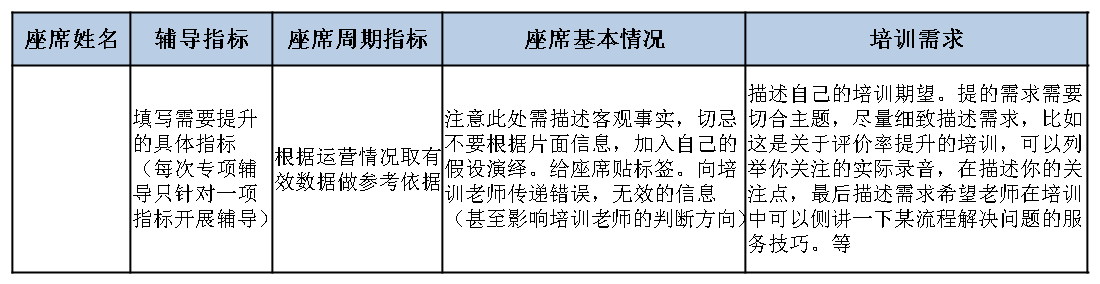 记录表格流转是便于复盘培训工作。我们将组长和培训老师的交互,比喻为是劳务关系的甲乙双方。甲方就如同我们的组长,她的特点是更加了解座席日常运营的工作问题和工作痛点,只有甲方信息提供准确,乙方的培训师才能精准定位问题,制定培训计划,所以流程缺一不可,这是工作中必要的沟通环节。除了复盘培训流程,还能避免培训老师和组长之间的工作矛盾,比如,组长指责老师培训不到重点,抱怨培训效果不明显。或培训老师抱怨组长忘恩负义,指责组长,效果不明显是因为其工作跟进不到位等情况导致的等,诸如此类的矛盾,当我们拿出文字记录,一一去复盘,更能促成我们有共同体这样的工作概念,哪有问题,我们就解决哪的问题。(如果组长直接负责辅导座席专项培训,可以省略第一步,第二步还是建议如实记录对于未来工作复盘很有帮助)