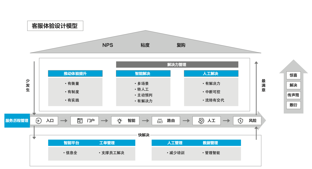 我们以下面这个数字化客服体系的框架来将以上亮点落地,你可以看到,整个框架突出了用户体验,以及服务设计者围绕用户的使用体验和服务体验而进行的设计布局。
